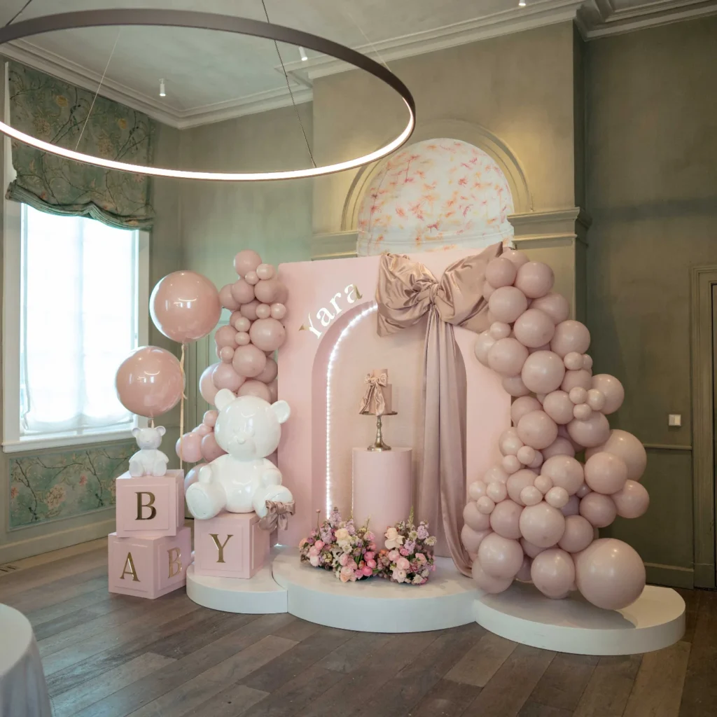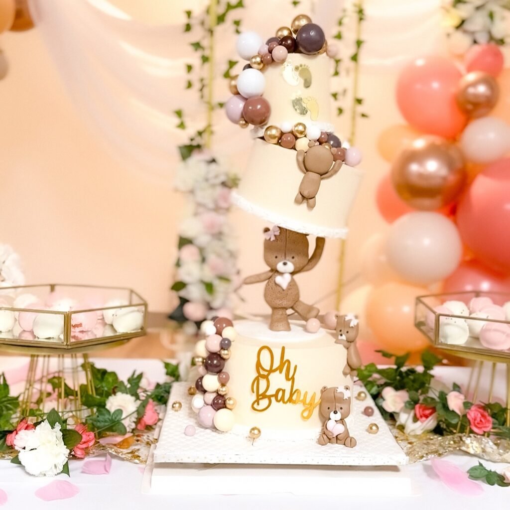 A big fluffy bear holds his spot next to soft cubes spelling “baby.” And front-and-center? A two-tier cake on a white pedestal, finished with florals and soft pink details. The backdrop mixes mesh and solid arches, making it look layered but not complicated.