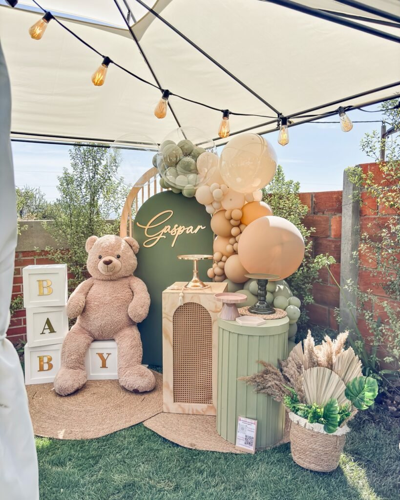 A giant fluffy bear sits right in the middle, with boxes spelling out “BABY” stacked beside him. Pampas grass adds height while gold balloons keep it festive. It’s soft but golden. Earthy but shiny.