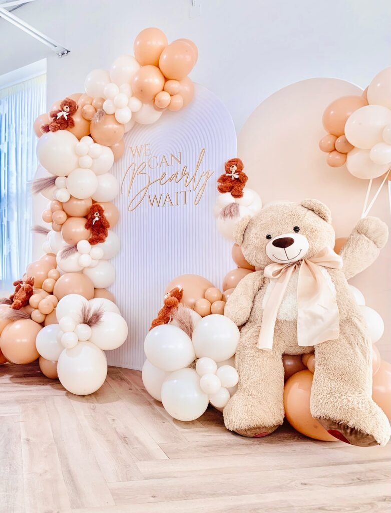 A giant plush teddy anchors the space with a stack of BABY blocks beside it. The balloon arch goes up one side, a little random but in a fun way. It’s not stiff it feels real. Wood textures show up in displays and props, including a cane-style feature table. So cute.