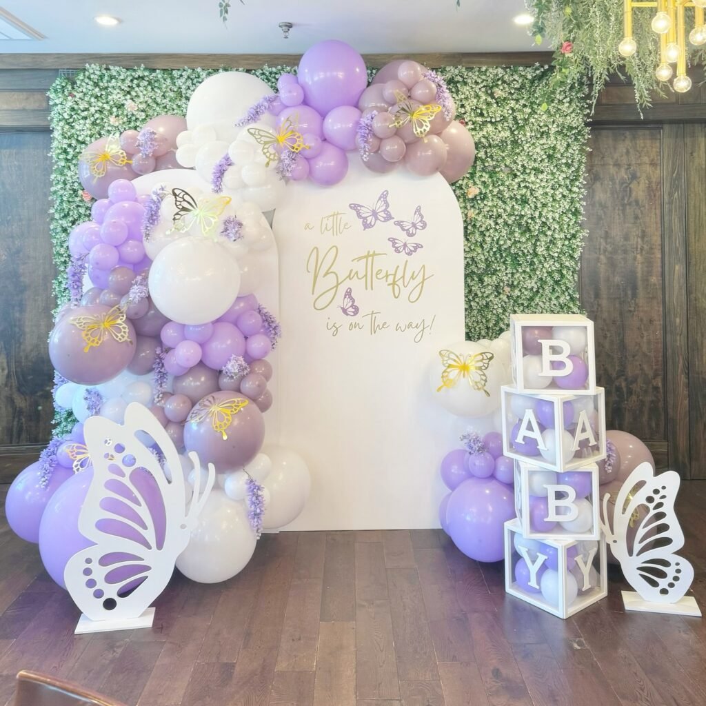 How cute is the phrase “a little butterfly is on the way”? This setup brings that feeling to life. With white and lilac balloons flying up the side, and little butterfly cutouts scattered throughout, it’s soft, pretty, and sweet without being too over the top.