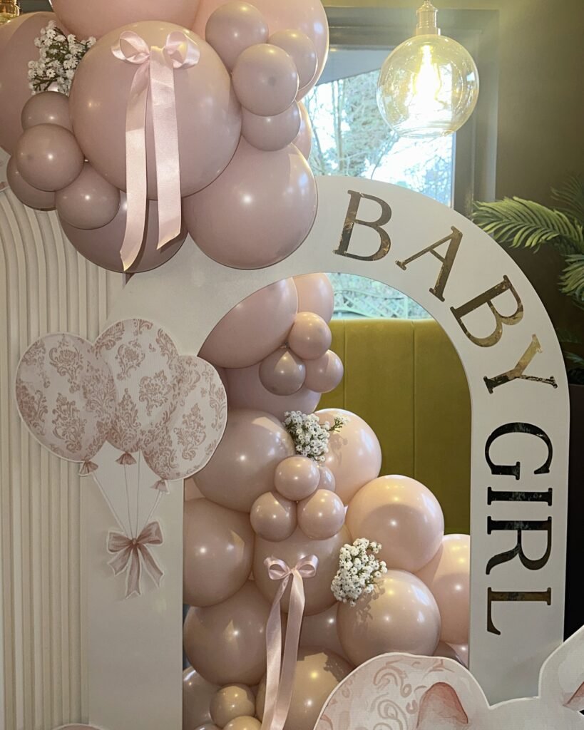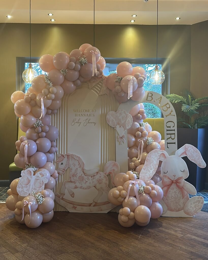 How often do you see bunnies, booties, and a rocking horse all in one shower and still looking this good? Baby Hannah’s setup is warm and vintage with soft pinks and cream balloons that fill the whole space.