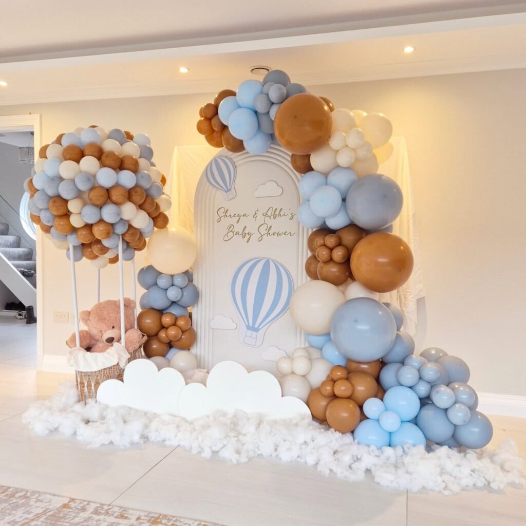 A teddy in a balloon-shaped bunch sits to the side like he’s ready for takeoff. And the text on the wall? “Shreya & Abhi’s Baby Shower.” Keeps everything personal with just one line.
