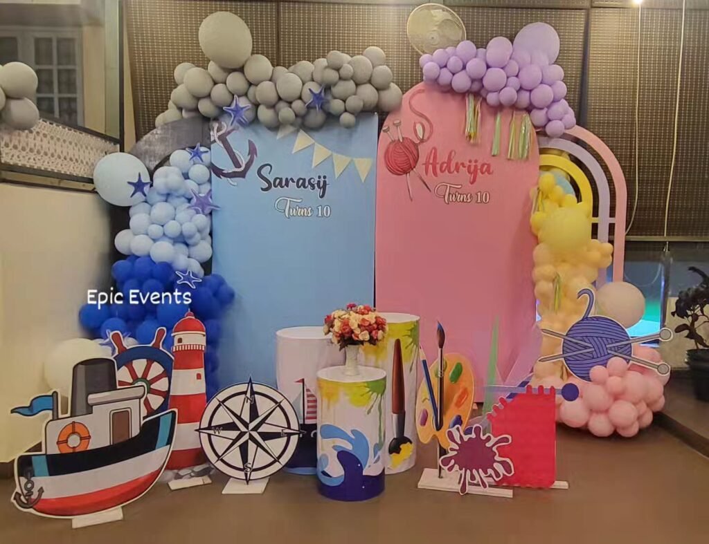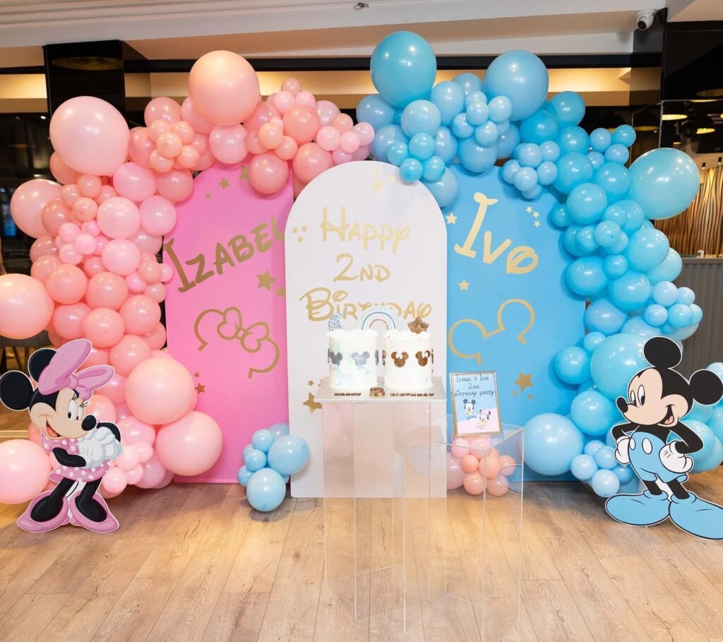 Color coding is a total lifesaver at twin parties. Pick one color for each twin and run with it balloons, plates, party hats, whatever. It helps guests know what belongs to who and makes organizing go smoother. Not just functional, it also adds structure to the decorations without being over the top. You can even ask guests to wear a color to represent each twin if you want to get playful. It’s an easy way to balance themes, help spotlight both kids, and add a cleanup-friendly touch.